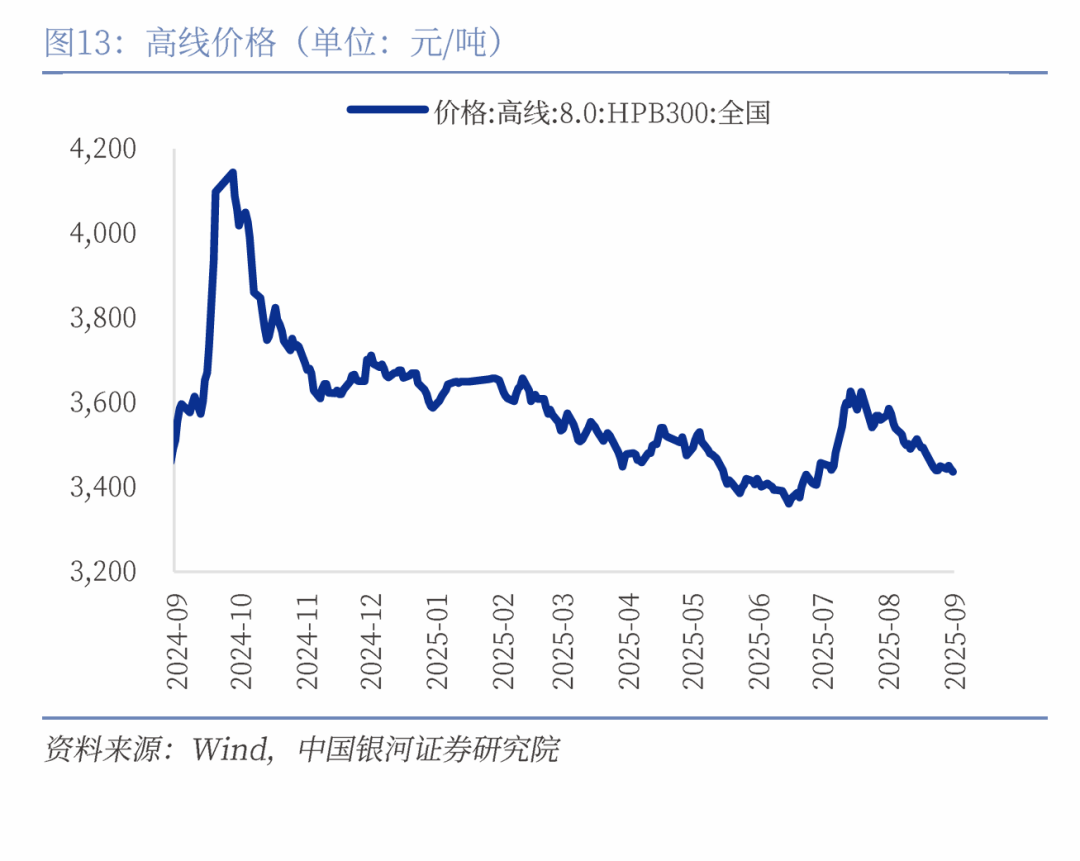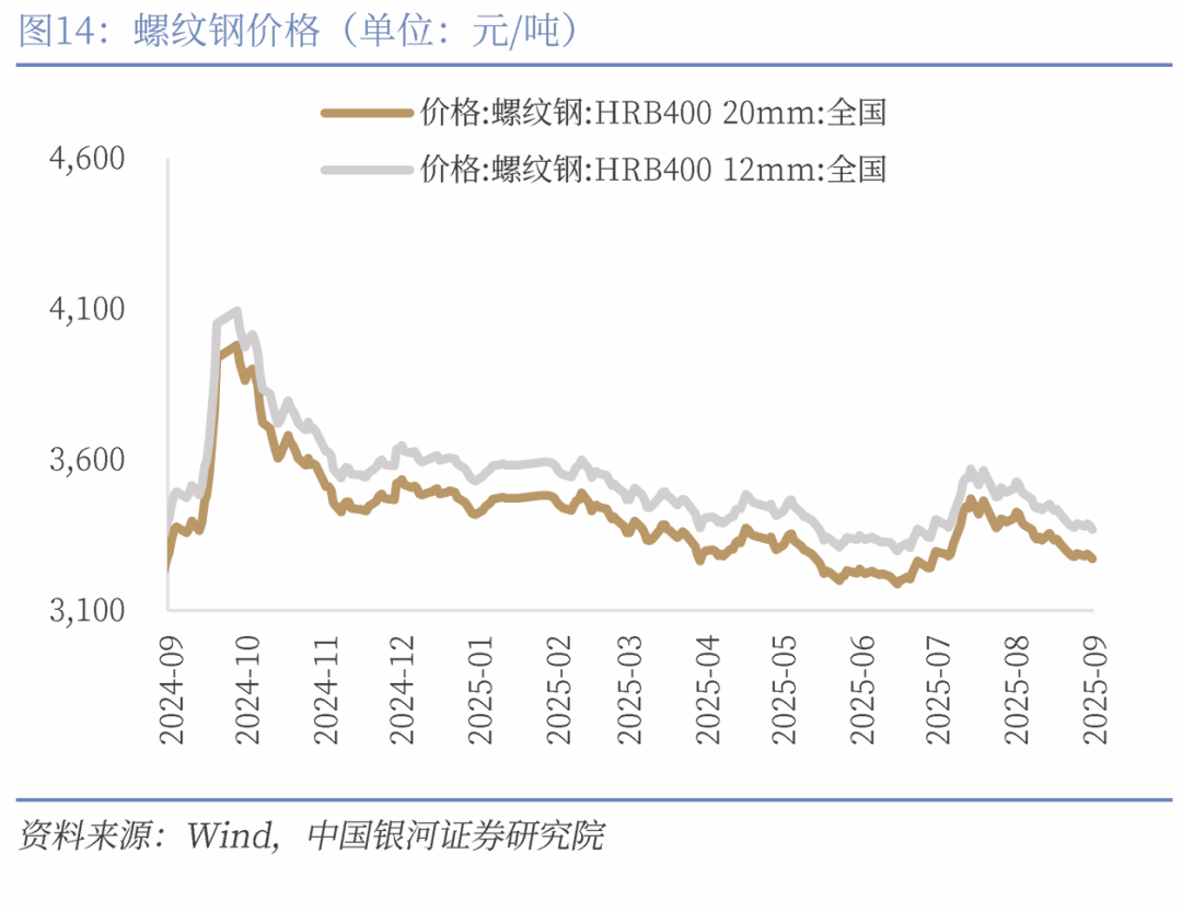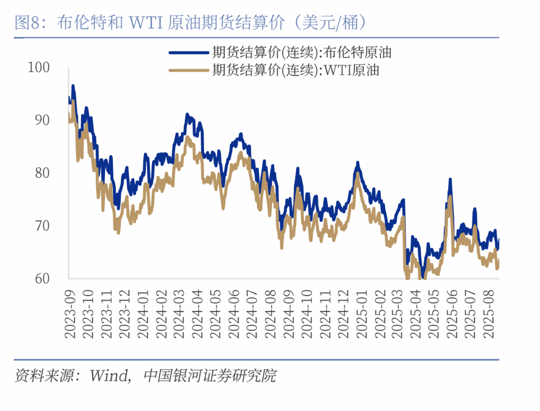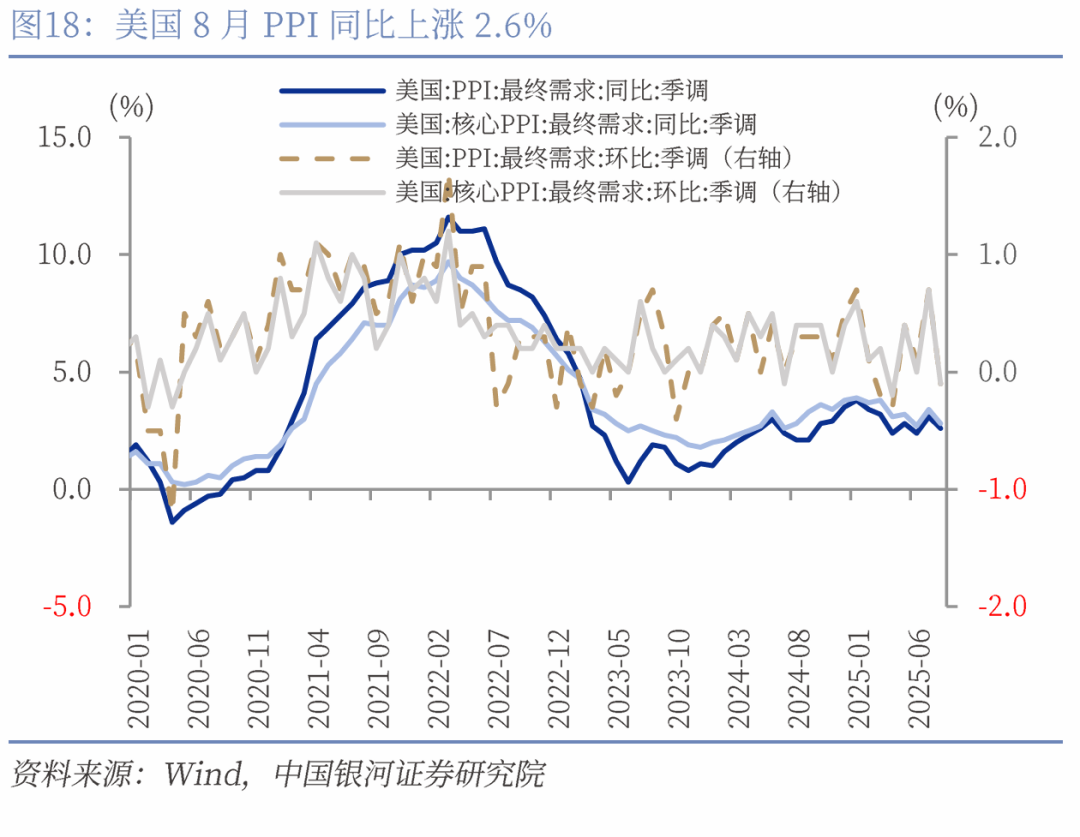 (2)PPI:原油价格持续回落,黑色系商品普遍回涨。截止9月12日,WTI原油下降1.87%,布伦特原油下降1.22%。美国原油库存增加,OPEC+开启第二阶段增产计划,全球原油供应过剩风险增强,叠加美国传统燃油消费旺季进入尾声,WTI原油和布伦特原油持续回调。黑色系商品方面,焦煤、焦炭和铁矿石价格环比分别上涨1.69%、1.41%和2.69%,螺纹钢价格下滑0.75%。钢厂开工率提高,补货需求升温,铁矿石价格持续上涨,部分煤矿为应对价格下行压力主动减产,焦煤、焦炭价格止跌回涨。
