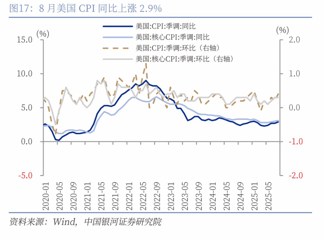 通胀符合预期,叠加就业疲弱,美联储宽松逻辑强化。经济层面:(1)通胀基本符合预期。美国8月CPI同比上涨2.9%,与预期一致;环比上涨0.4%,略高于市场预期的0.3%。核心CPI同比上涨3.1%,环比上涨0.3%,均与市场预期持平,显示关税传导效应可控,物价走势整体温和。(2)就业动能显著放缓。美国政府公布修订数据,截至今年3月的一年间,非农就业被下调91.1万人,相当于每月少增7.6万人,创2000年以来最大下修幅度。8月非农新增就业仅2.2万人,失业率升至4.3%,连续第二个月走高。