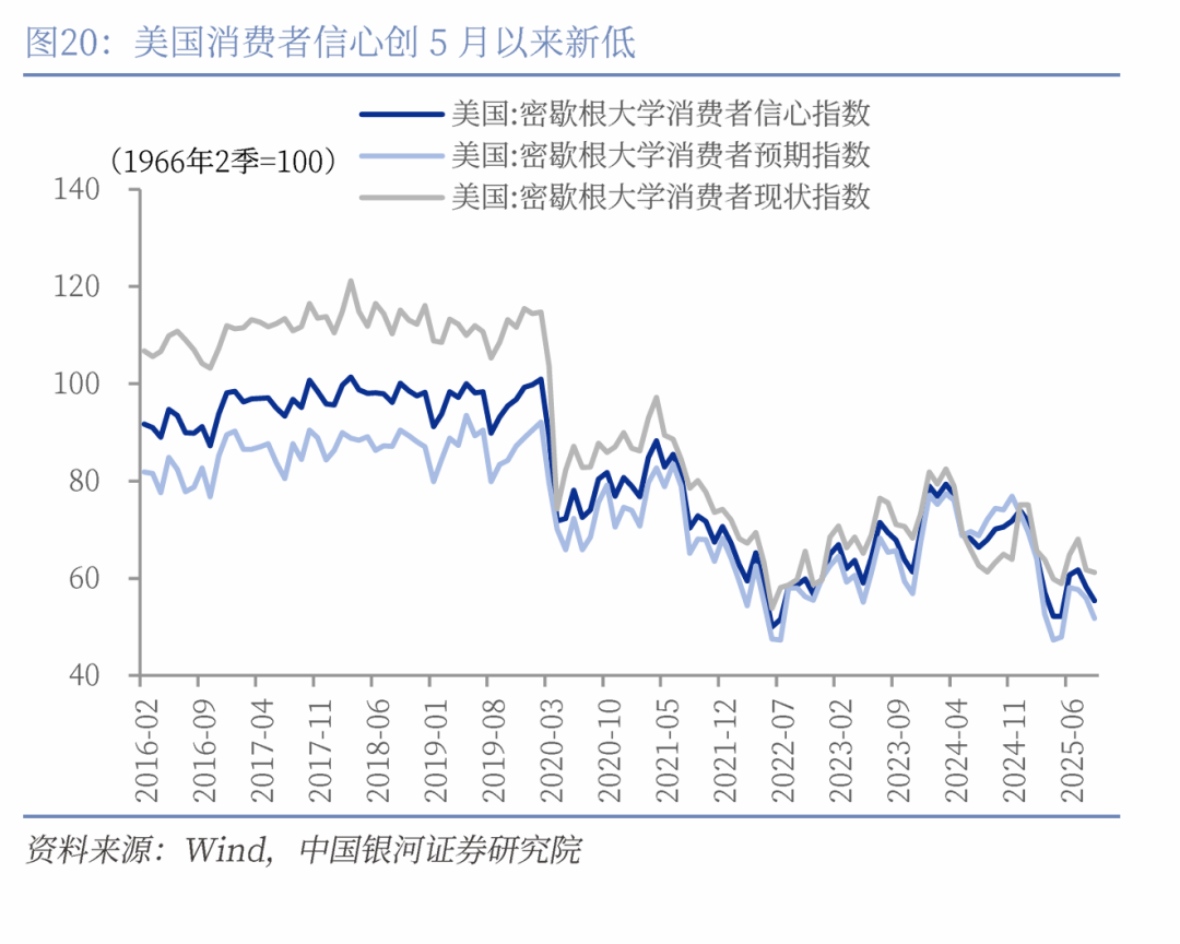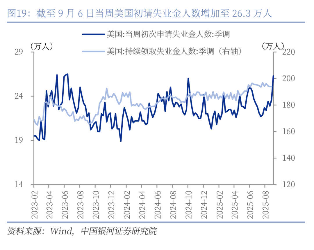 ADP数据显示8月就业人数增加5.4万人,低于预期的6.5万人,较上月修正值10.6万人大幅下滑。职位空缺JOLTS降至718.1万,创2024年9月以来最低。(3)美国初请失业金人数激增至26.3万人,为2021年10月以来最高。平均时薪36.53美元,环比上涨0.3%,同比上涨3.7%,薪资增速稳定但不足以抵消就业动能减弱的压力。(4)消费者信心再度下滑。美国9月密歇根大学消费者信心指数初值55.4%,创今年5月以来新低,远低于预期58%,显示家庭对经济前景的担忧明显上升。通胀预期方面,1年期预期维持在4.8%,但5年期预期升至3.9%,创6月以来最高,凸显长期物价压力。调查负责人指出,消费者对个人失业风险的担忧升温,高物价亦持续挤压家庭支出空间。