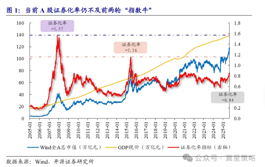 对比过去显著指数牛,当前估值空间充足。我们于2025年8月22日发布的报告《证券化率看牛市估值》中指出,将证券化率指标(股市总市值与GDP之比)作为识别估值高点的有效参考工具。在2005–2007年与2014–2015年的指数牛阶段,该指标分别上升至1.57和1.16。当前证券化率为0.84,整体估值或仍有一定上行空间。