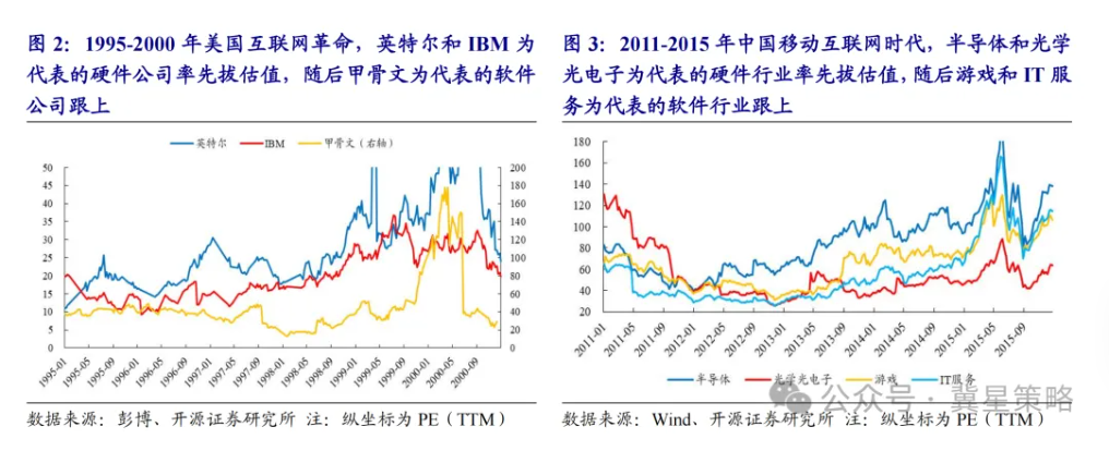 科技行情下,硬件和软件应用是两个永恒的主题。在科技产业周期中,硬件与软件始终呈现“硬件先行、软件跟上”的客观规律。复盘1990s美国互联网革命、2010s中国移动互联网时代,均存在硬件公司先拔估值,软件应用公司后跟上的现象。