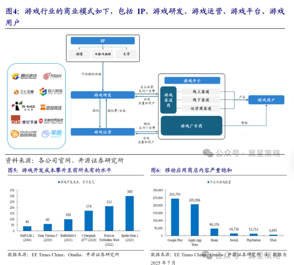 游戏的商业模式,造就了游戏行业“高投入、高风险、高回报,长周期”的特征。按游戏行业的环节及参与玩家,可分成IP、游戏开发、游戏运营、游戏平台、游戏用户。高投入主要体现在游戏开发环节;近年来,尽管疫情后游戏市场增长乏力,游戏开发成本却持续大幅提升。高风险体现在游戏市场内容严重饱和,新款游戏的脱颖而出难度不断提升,竞争加剧。高回报和长周期体现在游戏用户的黏性以及具备较强的付费意愿。