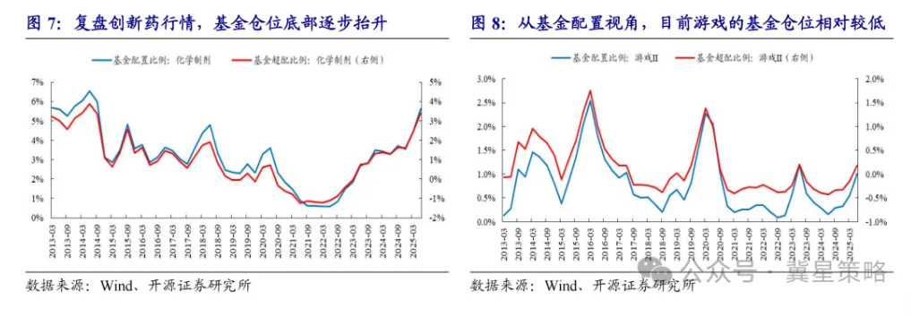 (2)基金仓位相对较低。无论是基金配置比例,还是基金超配比例,游戏均处于相对较低的位置,2025年Q2末基金配置比例0.99%,基金超配比例0.18%,处于相对较低的位置,前两轮游戏的基金超配比例最高可达1.75%、1.39%。回顾创新药行情前,对应基金仓位也存在相对较低的特征,在2025年创新药上涨过程,基金配置比例及超配比例不断抬升。