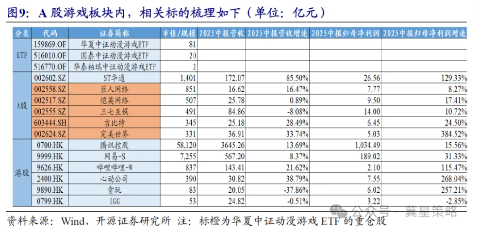 A股游戏板块内,按市值大小,ST华通、巨人网络、恺英网络、三七互娱、吉比特、完美世界排名靠前,其中除ST华通外,均为华夏中证动漫游戏ETF的重仓股。我们于2025年9月7日《行业分化下,市场的配置思路发生变化》报告中提出,在居民资金入市方式变化下,ETF权重股或强于微盘股。因此,游戏板块内,我们更倾向从ETF权重股里进行择股。