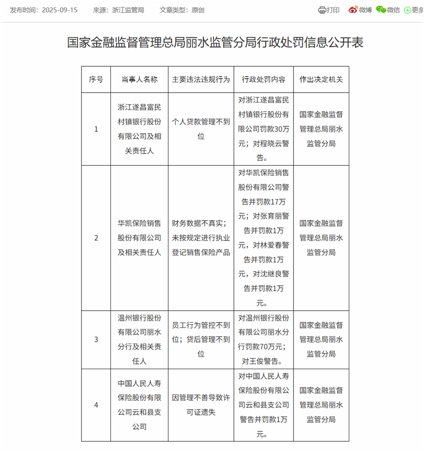 9月15日,国家金融监督管理总局披露了2张罚单,披露对浙江遂昌富民村镇银行股份有限公司、华凯保险销售股份有限公司、中国人民人寿保险股份有限公司云和县支公司、温州银行股份有限公司与旗下丽水分行,及各被罚单位的相关责任人的违规处罚情况。