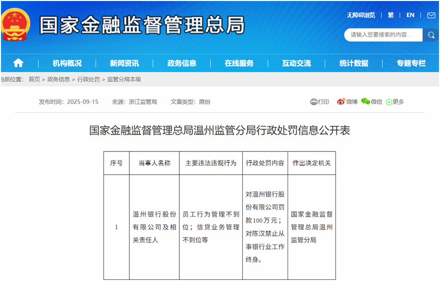 与此同时,国家金融监督管理总局温州监管分局行政处罚信息公开表显示,温州银行股份有限公司及相关责任人,因“员工行为管理不到位;信贷业务管理不到位等”,对温州银行股份有限公司罚款100万元;对陈汉禁止从事银行业工作终身。