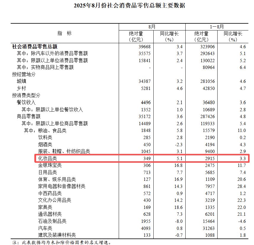 9月15日,国家统计局发布了今年8月、1-8月的社零数据,按消费类型分,8月、1-8月化妆品类零售额分别为349亿元、2915亿元,分别同比增长5.1%、3.3%。且值得注意的是,单月化妆品类零售额同比增长跑赢了社零大盘。