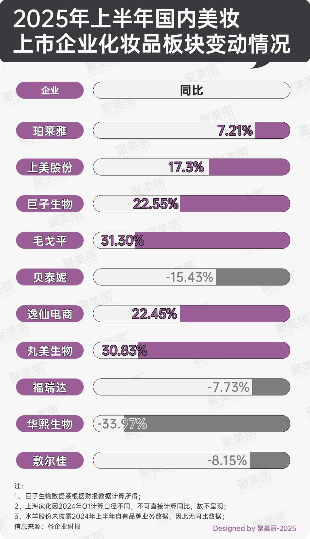 聚焦头部国货美妆来看,聚美丽此前统计了2025年上半年国内美妆上市企业TOP榜(详见),其中,在化妆品板块,6家呈增长,4家呈下滑。