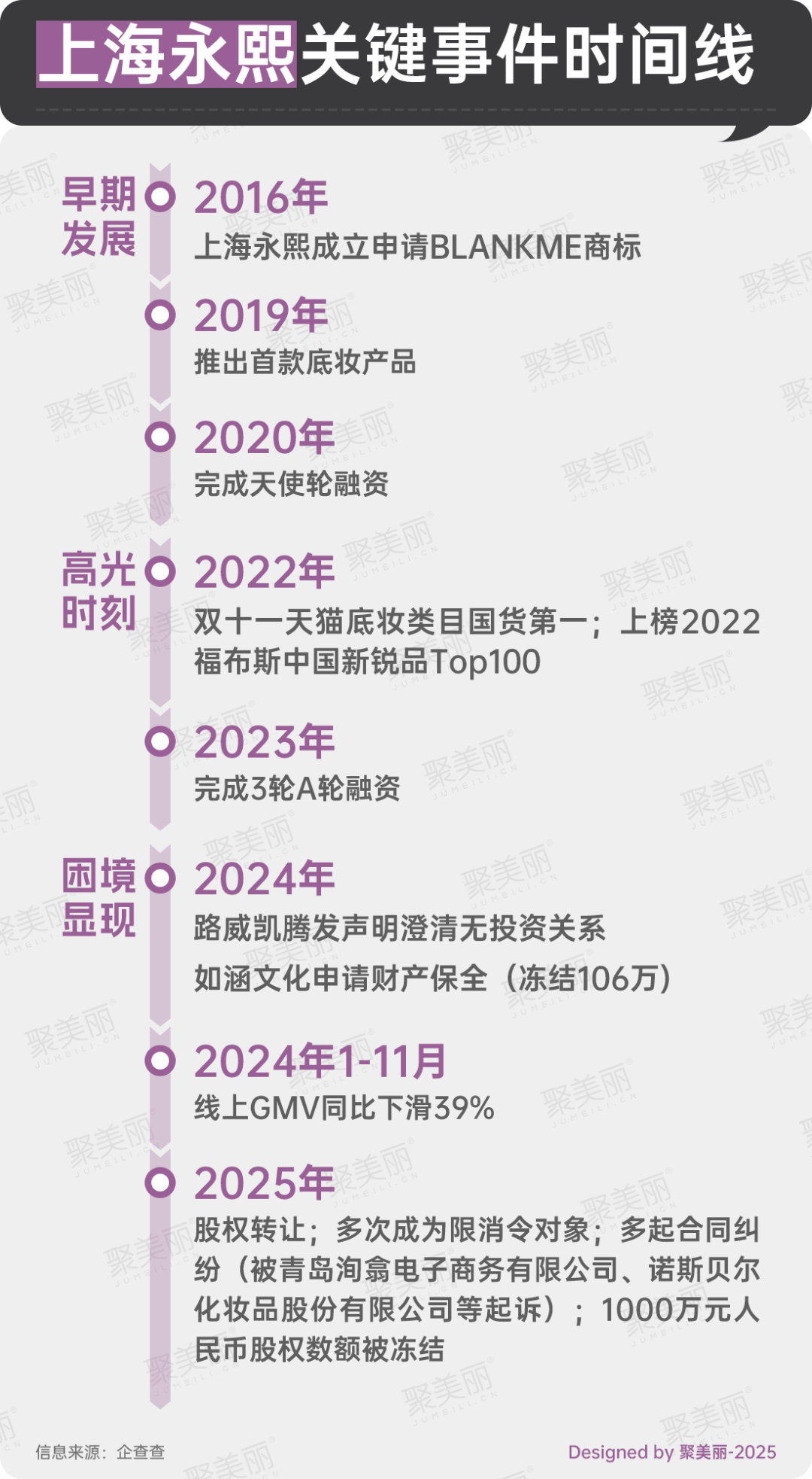 如华熙生物旗下新锐护肤品牌润熙泉被爆疑似闭店,再如,曾经是“国货底妆第一”的新锐品牌blankme半分一,其母公司上海永熙信息科技有限公司(以下简称:上海永熙),面临多重债务危机缠身,作为被告共涉及17起开庭公告,其中11次被列为被执行人,被执行总金额高达1241.44万元。