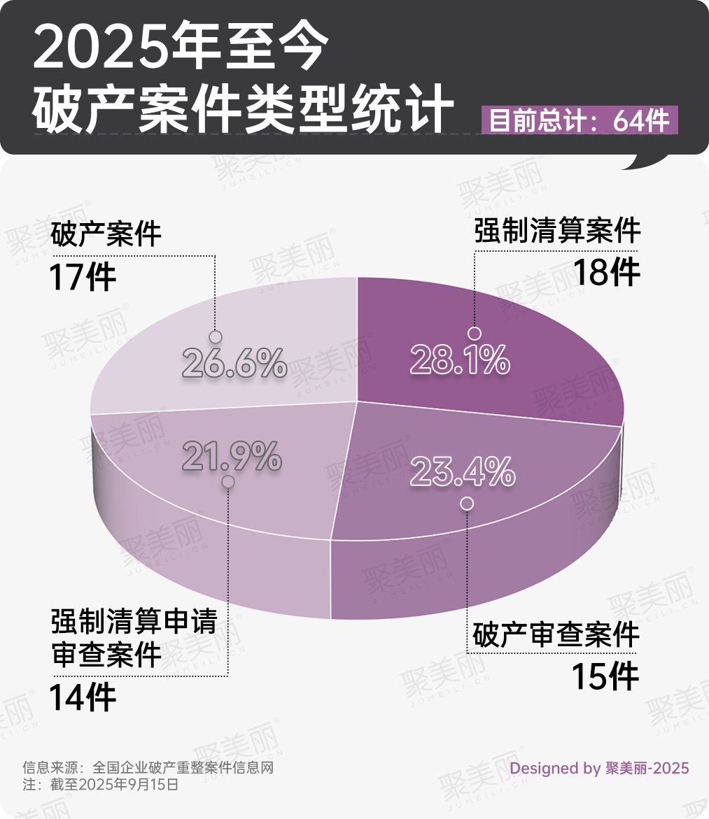 时至9月中旬,经聚美丽在全国企业破产重整案件信息网查询发现,共计已有64起化妆品企业破产相关案件。上周,聚美丽在《国货护手霜龙头被申请破产!》一文中报道,东洋之花母公司上海瑞慈化妆品有限公司申请破产清算。