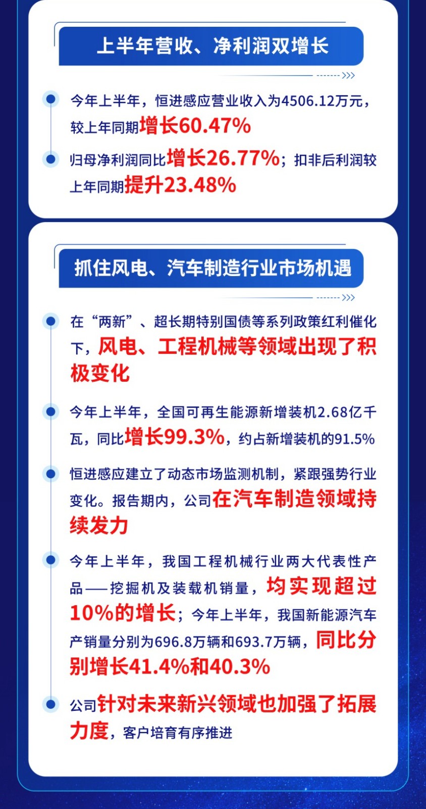 另一方面,恒进感应建立了动态市场监测机制,紧跟强势行业变化。报告期内,公司在汽车制造领域持续发力,同时,公司针对未来新兴领域也加强了拓展力度,客户培育有序推进。