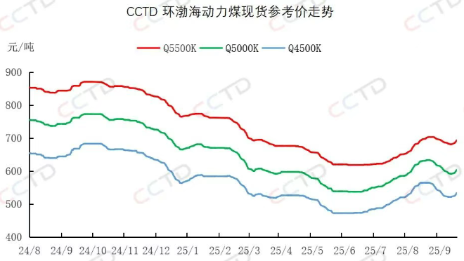 截至9月17日,“CCTD环渤海动力煤现货参考价”5500K、5000K、4500K三个规格品价格分别收于693、603、533元/吨,日环比分别上涨5、5、6元/吨,较前期低点均上涨12元/吨。