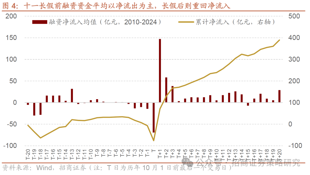 国庆长假前后,融资盘通常呈现出“节前收敛、节后迸发”的变化规律。节前融资盘多趋向谨慎,作为高风险偏好资金,在国庆长假前,融资客会倾向于卖出股票偿还融资,减少持仓,以规避长假期间可能出现的不可预测的风险和利息成本。从2010-2024年历史平均表现看,融资在节前5个交易日均以卖出为主,节前最后一个交易日平均流出规模最高为69亿元。国庆节后,如果假期期间没有重大利空,或者甚至有利好政策释放,市场风险偏好会快速回升,融资客会成为重要的增量资金之一,大举入市,2010-2024年融资资金在国庆后首个交易日平均净流入147亿元,且随后的20个交易日大部分时间均保持净流入趋势。