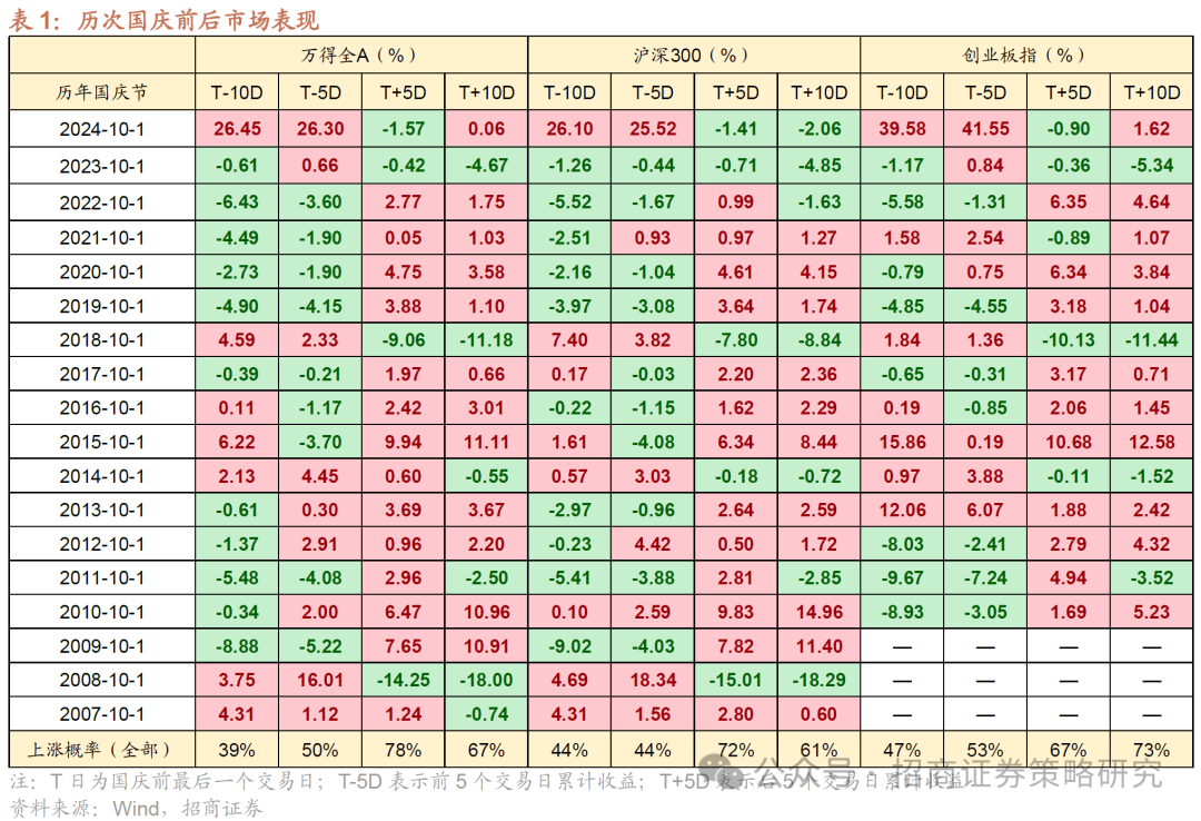 A股国庆节前后市场表现同样呈现出一定的日历效应。具体来说,国庆节前市场交投相对清淡,部分资金在避险需求下流出,导致市场表现不佳。然而,国庆节后市场风险偏好改善,主要指数往往迎来反弹。从过去十年A股国庆节后一周表现来看,上证指数、沪深300、中证1000指数上涨概率均超60%。从2007年以来的数据统计看,万得全A在国庆节后5个交易日区间上涨概率达78%。