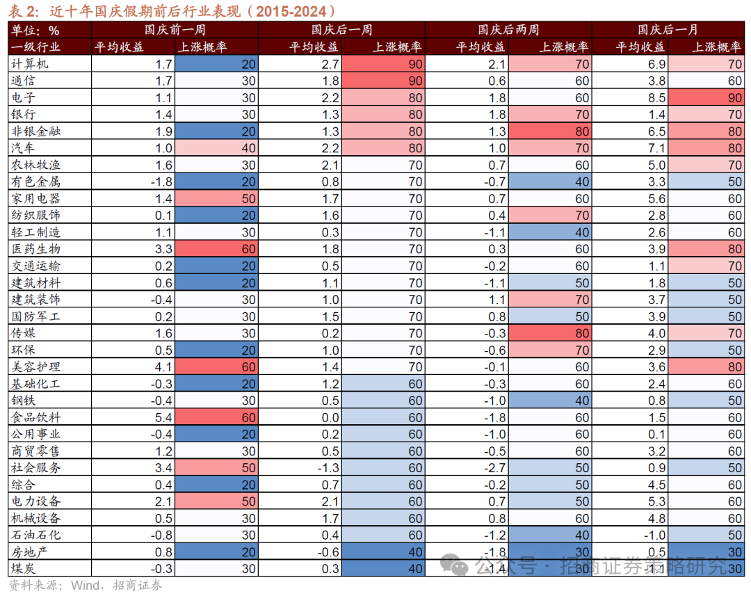 ⚑【观策·论市】国庆前后A股融资盘与日历效应:国庆长假前后,融资盘通常呈现出“节前收敛、节后迸发”的变化规律。并且A股国庆节前后市场表现通常呈现出一定的日历效应。国庆节前市场交投相对清淡,部分资金在避险需求下流出,导致市场表现平淡。然而,国庆节后市场风险偏好改善,主要指数往往迎来反弹。从过去十年A股国庆节后一周表现来看,上证指数、沪深300、中证1000指数上涨概率均超60%。行业层面,国庆后五个交易日一级行业上涨概率普遍在50%以上,其中上涨概率靠前的行业集中在计算机、通信、电子等行业,其中银行、非银金融、汽车在国庆后两周和国庆后一个月上涨概率仍然较高。