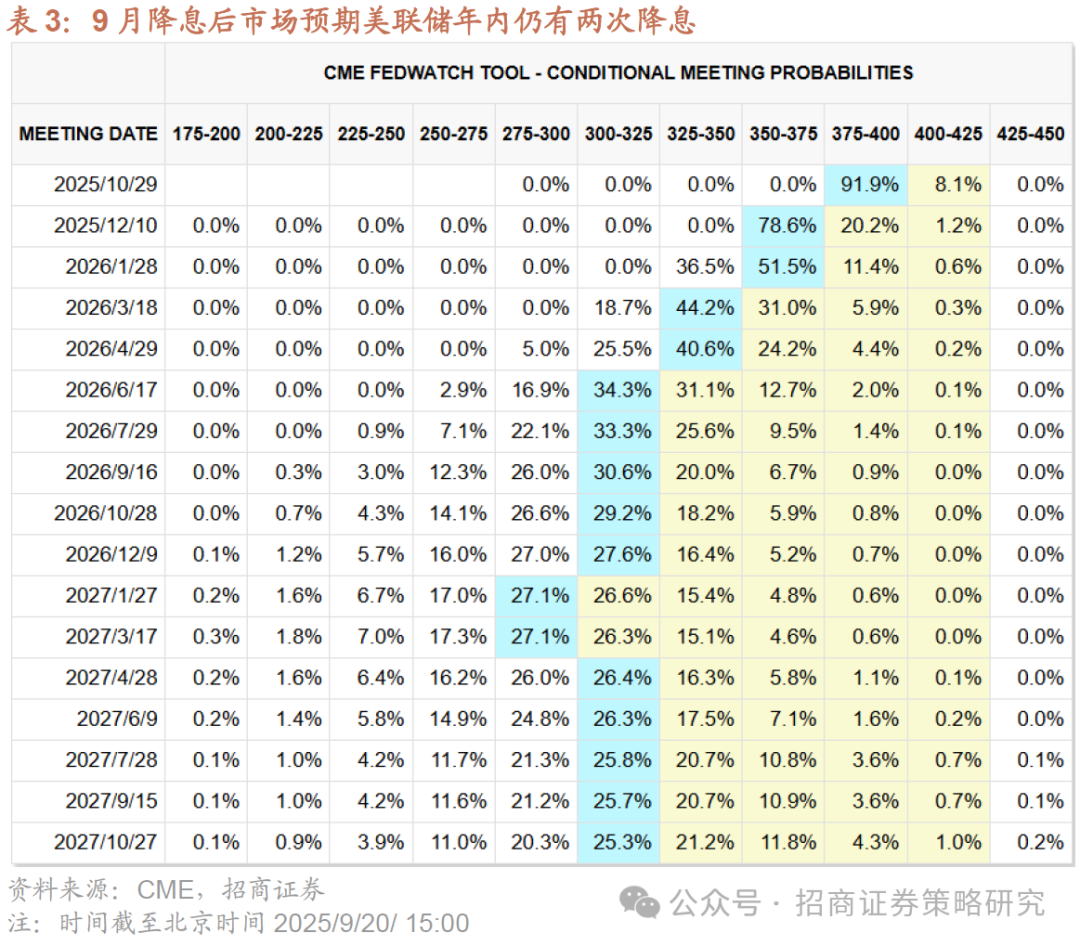 9月美联储议息会议整体符合市场预期,呈现鸽派决策+鹰派表述的预期管理。会议如期降息25bp,且给出的降息指引显示年内仍有50bp的降息空间。同时,鲍威尔表示,9月的降息举措是一项风险管理决策,没有必要快速调整利率,今天对于降息50个基点并没有广泛的支持。9月的点阵图显示,大多数委员支持2025年内仍有50bp的降息空间;过半数委员支持2026年至少还有25bp降息空间,目前市场普遍预期美联储年内仍有两次降息。