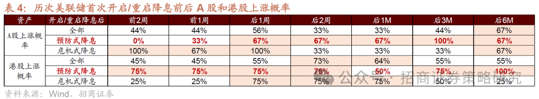 根据历史经验,在历次美联储首次开启/重启预防式降息后,A股和港股在未来上涨概率更高。显示中国资产受益于预防式降息下宽松的美元流动性环境。具体来看,港股在未来1周、2周上涨概率达到75%。在预防式降息后的3个月A股和港股上涨概率分别达到100%和75%;降息后的半年,港股上涨概率达到100%。中期维度上,整体继续看好美联储重启降息环境下,A股和港股的投资机会。