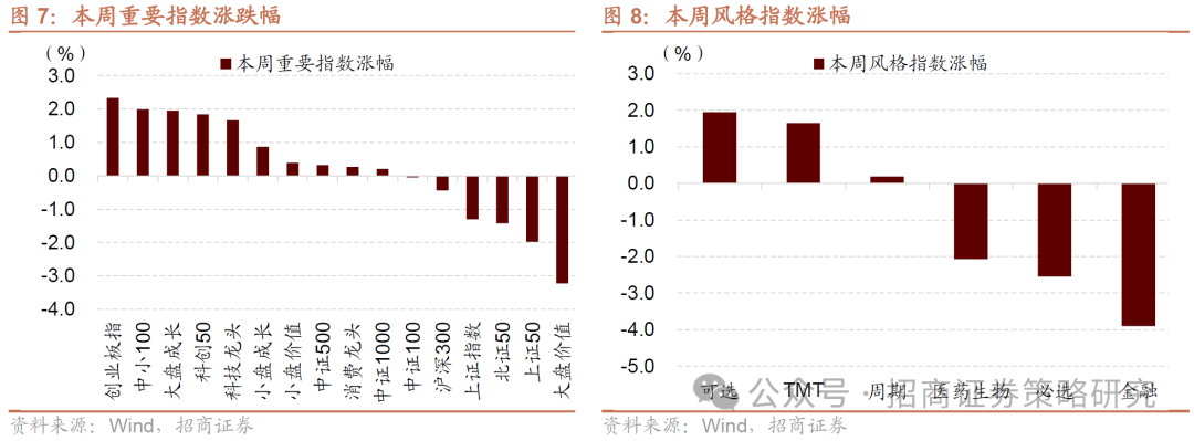 本周(9月15日-9月19日)A股市场主要指数涨多跌少。主要指数中,创业板指、科技龙头表现较好,分别上涨2.34%、2.22%;主要指数中上证50、大盘价值表现较弱,分别下跌1.98%、3.23%。本周日均成交额25718.46亿元,周度上涨10.55%。