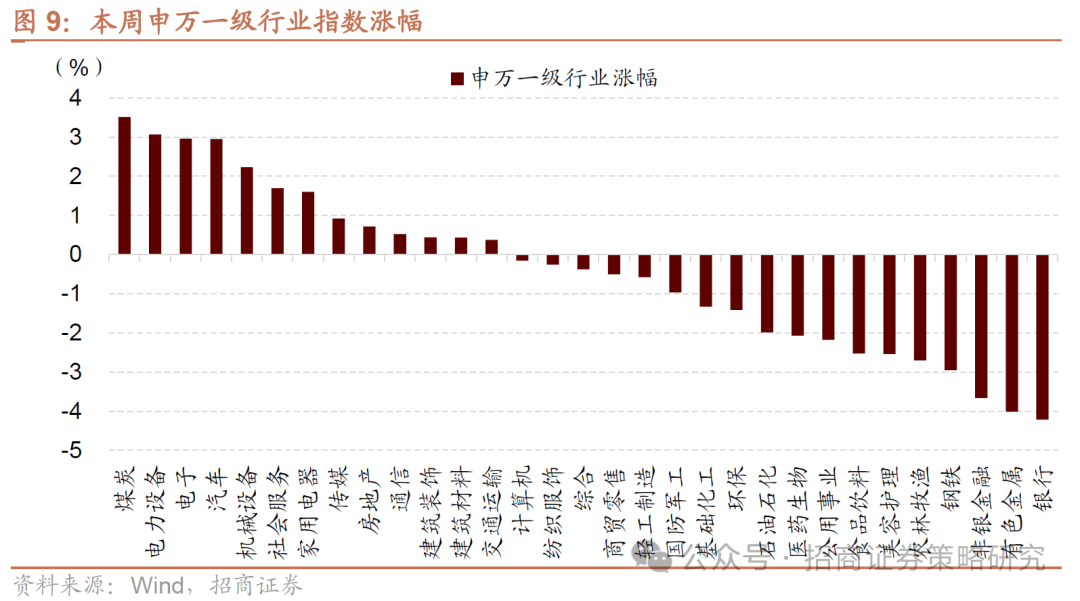 从行业上看,本周申万一级行业涨跌参半,煤炭(3.51%)、电力设备(3.07%)、电子(2.96%)等表现相对较好;非银金融(-3.66%)、有色金属(-4.02%)、银行(-4.21%)等表现相对较差。从上涨原因看,本周表现较好的板块及主要原因:煤炭(前期调整时间充分具备补涨需求)、电力设备(行业龙头2026年排产数据超市场预期提振远期估值)、电子(中美关系恶化叠加政策催化);跌幅居前的行业原因,非银金融、银行(指数震荡状态下不具备较强的进攻属性)、有色金属(美联储降息落地利好兑现)。