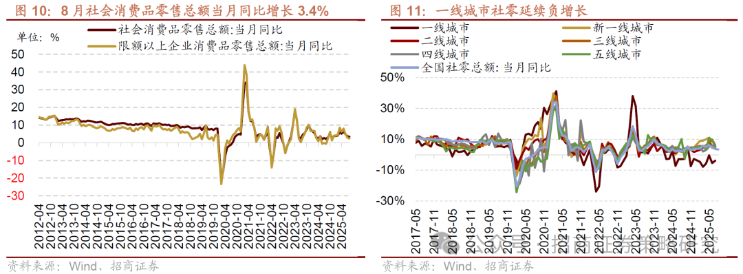 从地域来看,一线城市仍是社零修复的主要拖累,二线、三线、四线、五线城市社零同比增速均有放缓。根据地方统计局最新数据,7月一线城市(北上广深)社零同比-3.9%,延续8个月负增;7月新一线(10城)、二线(11城)、三线(24城)、四线(34城)、五线(22城)社零同比分别为4.7%、4.3%、6.2%、5.3%和5.4%。