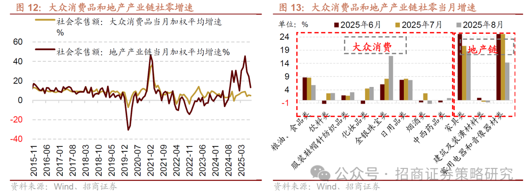 大众消费品、地产产业链加权平均增幅均收窄,家电、家具在政策提振下维持双位数增长,金银珠宝、文化办公用品表现亮眼。大众消费品产业链当月加权平均增幅收窄至4.8%(前值5.3%),细分领域必选消费表现分化,小额可选消费普遍改善,必选消费中限额以上粮油食品单月同比增幅收窄至5.8%,烟酒同比转负至-2.3%,高温天气影响叠加服装换季需求,饮料、服装鞋帽针纺织品同比增幅分别扩大至2.8%和3.1%。可选消费中化妆品、金银珠宝、中西药品类同比增幅分别扩大至5.1%、16.8%和0.9%,日用品类增幅收窄至7.7%。