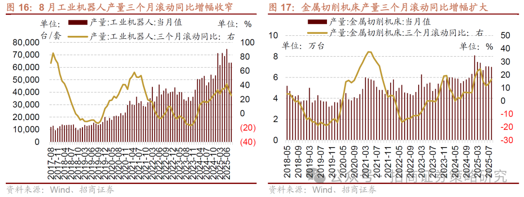 8月工业机器人产量同比增幅收窄,三个月滚动同比增幅收窄。8月工业机器人产量6.37万台/套,当月同比增幅收窄9.60个百分点至14.40%,三个月滚动同比增幅收窄7.03个百分点至25.43%;1-8月累计产量51.21万台/套,累计同比增幅收窄3个百分点至29.90%。
