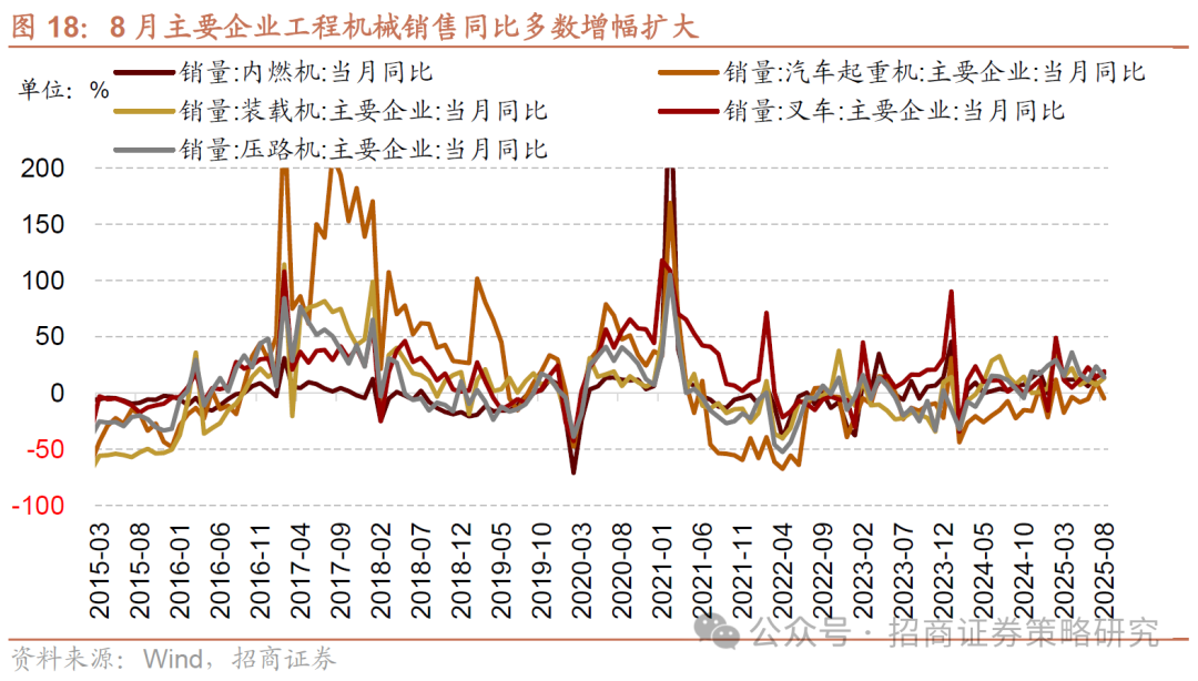 8月主要企业工程机械销售当月同比多数改善。主要企业装载机销量同比增幅扩大5.89个百分点至13.30%,三个月滚动同比增幅扩大2.02个百分点至10.67%;主要企业叉车销量同比增幅扩大5个百分点至19.40%,三个月滚动同比增幅扩大2.53个百分点至18.97%;主要企业压路机销量同比增幅收窄9.70个百分点至14.10%,三个月滚动同比增幅收窄0.97个百分点至16.37%;主要企业汽车起重机销量同比由正转负至-4.65%(前值为9.60%),三个月滚动同比跌幅收窄1.15个百分点至-0.11%;主要企业内燃机销量同比增幅扩大3.35个百分点至17.63%,三个月滚动同比增幅扩大1.77个百分点至12.72%。