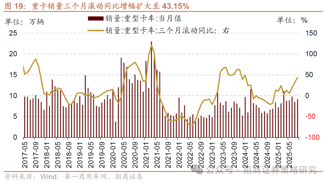 8月重卡销量同比增幅扩大。根据第一商用车网数据,2025年8月我国重卡市场销售约9.16万辆(批发口径,包含出口和新能源),环比2025年7月上涨7.93%,同比上涨46.71%,三个月滚动同比增幅扩大11.04个百分点至43.15%。