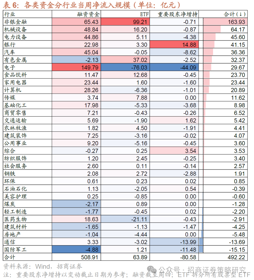 ⚑ 【资金·众寡】融资净流入与ETF净申购,新发基金规模回升。融资资金前四个交易日合计净流入507.9亿元;新成立偏股类公募基金221.1亿份,较前期上升58.7亿份;ETF净申购,对应净流入62.4亿元。融资资金净买入电子、非银金融、机械设备等;券商ETF申购较多,医药ETF赎回较多。重要股东净减持规模扩大,计划减持规模下降。