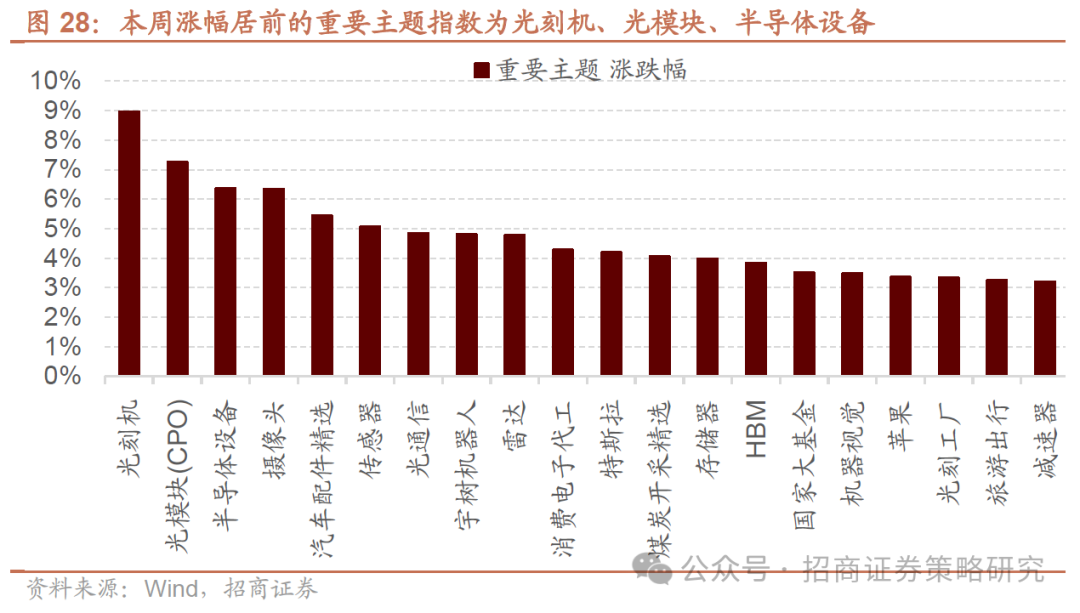 本周A股市场跌多涨少,万得全A下跌0.18%,沪深300下跌0.44%,创业板指上涨2.34%。A股涨幅居前的重要主题指数为光刻机、光模块、半导体设备。