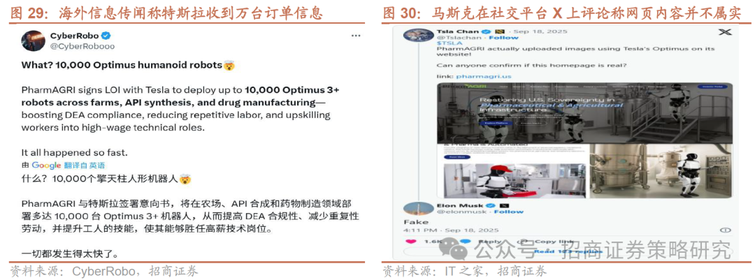 ⚑ 【主题·风向】特斯拉机器人持续推进落地,下周将召开机器人生产计划会议。本周特斯拉机器人产业热点不断:近日,海外Eletric Vehicles等多家媒体发布消息称,特斯拉与美国植物基制药企业PharmAGRI合作签署意向书,PharmAGRI计划在其自营农场和处方药生产环节部署多达1万台特斯拉最新款Optimus Gen3+人形机器人,引发市场持续关注;随后,当地时间9月18日,马斯克对此进行评论澄清消息不实。马斯克于当地时间9月16日在社交平台上表示,下周将在特斯拉内部与各部门开会,特别关注人工智能/自动驾驶系统、擎天柱(Optimus)机器人生产计划以及车辆生产和交付。