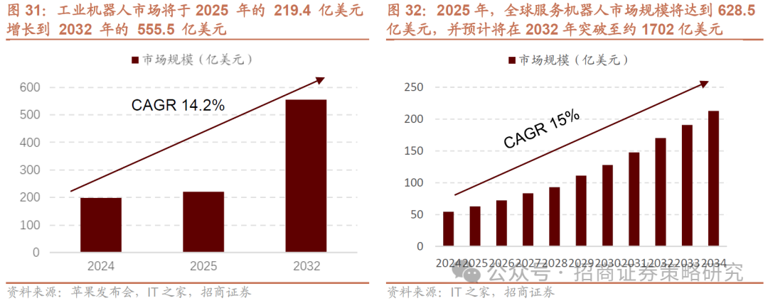 随着智能制造和人形机器人应用的拓展,服务机器人特别是人形机器人市场的增速将快于工业机器人,显示出新兴赛道的成长性。根据先前PR与FB所发布的最新数据显示,服务机器人市场相比工业机器人预计在未来几年内增长率要高,至2032-2034 年,其增长可能更快、占比将越发显著。此外,由于服务机器人覆盖业务范围更广(包含了医疗、物流、家庭、商业服务等),所以其应用场景与未来潜力被普遍看好,因此未来服务机器人产业有望进一步发展演进。
