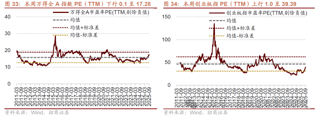 本周整体A股估值水平下行。截至9月19日收盘,万得全A指数PE(TTM)为17.28,处于历史估值水平(10年以来)的67.7%分位数。创业板指PE(TTM)上行1.0至39.39,处于历史估值水平的37.9%分位数。代表大盘股的沪深300指数PE(TTM)下行0.2至13.23,处于74.4%分位数。代表中小盘股的中证500指数PE(TTM)上行0.1至25.99,处于历史估值水平的48.6%分位数。