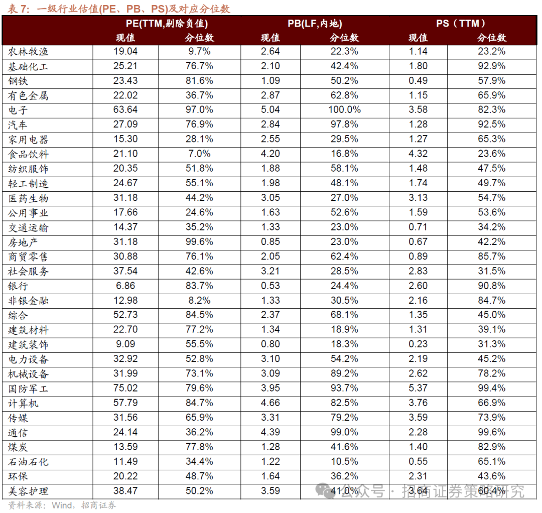 在行业估值方面,本周指数估值涨跌分化,其中,电子、电力设备和汽车估值涨幅居前,钢铁、有色和美容护理跌幅居前。电子指数估值上涨2.24至63.64,处于97.0%历史分位(近十年,下同);电力设备指数估值上涨1.39至32.92,处于52.8%历史分位;汽车指数估值上涨0.83至27.09,处于76.9%历史分位;钢铁指数估值下跌0.73至23.43,处于81.6%历史分位;有色指数估值下跌1.08至22.02,处于36.7%历史分位;美容护理指数估值下跌1.07至38.47,处于50.2%历史分位。截至9月19日收盘,一级行业估值排名前五的行业分别是国防军工、电子、计算机、美容护理、社会服务。