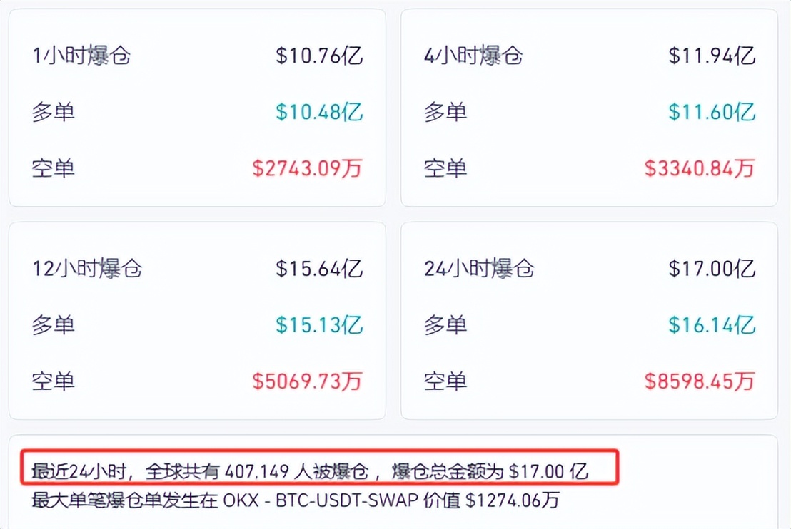 Coinglass数据显示,仅1个小时的时间,加密货币全网合约就爆仓了超10亿美元,其中97%为多单爆仓。24小时内,加密货币市场全网合约爆仓17亿美元,爆仓人数超过40万人,其中超九成为多单爆仓。