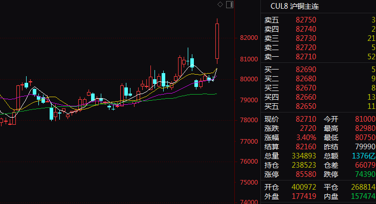 9月25日,在国际铜价带动下,沪铜主力合约2511单日大涨约3.5%,逼近83000元/吨,为2024年6月以来高点。