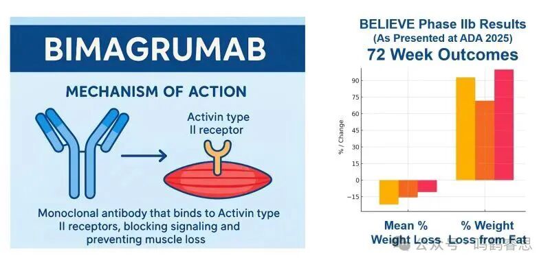 Bimagrumab是一种全人源单克隆抗体,通过阻断II型激活素受体,从而抑制肌肉生长抑制素的活动。这一机制不仅能够减少脂肪堆积,还可能促进肌肉生长。