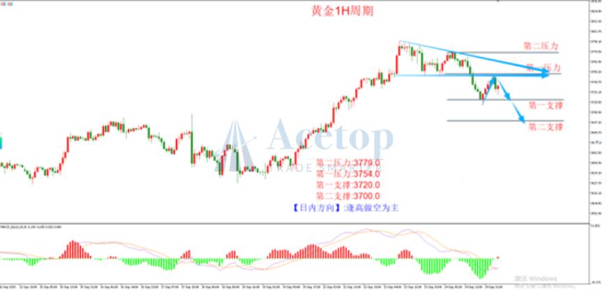 上图为黄金1小时图。从形态上看,黄金多头承压在历史压力位3790美金后开始震荡下行,高位构建了一个收敛三角形顶部形态,昨日空头发力跌穿了三角形下边支撑3752美金后,确立了短期顶部形态,后市将展开一波下行调整浪机会。从k线角度看,昨日空头大阴线破位且连续阴线下行,表明空头力度较强,后市继续看新低走势。从下方MACD指标来看,快慢线高位形成背离信号且跌入0轴下方,表明短线超买见顶,多转空节奏。策略上建议空头浪节奏找压力位埋伏空单思路为主。
