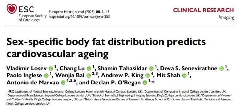 LOSEV V, LU C, TAHASILDAR S,et al. Sex-specific body fat distribution predicts cardiovascular ageing[J]. Eur Heart J,2025 Aug 22:ehaf553.DOI:10.1093/eurheartj/ehaf553