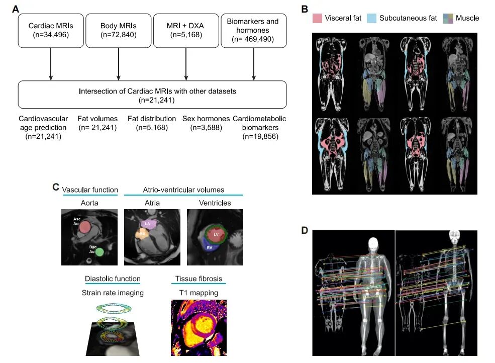 本研究是一项基于大规模人群的横断面研究,旨在评估性别特异性脂肪分布对心血管衰老的影响。研究纳入了来自英国生物银行的21,241名参与者,年龄在40至69岁之间。参与者被分为不同性别组,通过全身成像技术评估脂肪分布,包括内脏脂肪组织(VAT)、腹部皮下脂肪组织(ASAT)、肌肉脂肪浸润(MATI)和肝脏脂肪分数(PDFF),见图1。研究使用机器学习算法预测心血管年龄,并计算心血管年龄差,即预测年龄与实际年龄的差值。通过多变量线性回归分析,研究评估了脂肪分布与心血管年龄差之间的关系,同时调整了年龄、性别等混杂因素。