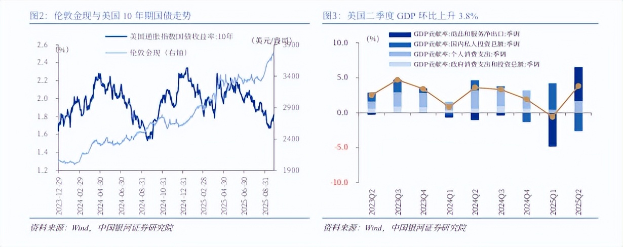 本周,黄金价格创下历史新高,进入了高位震荡阶段。9月22日,伦敦金升至3758.78美元/盎司,再创历史新高,本周黄金涨幅扩大至2.01%,黄金成为大宗商品市场的焦点,引起大量资金不断涌入。本周黄金延续上周涨势,市场继续消化美联储降息影响。尽管如此,美国强劲的经济数据一定程度压制了黄金价格。美国商务部当地时间25日公布的二季度GDP最终修正数据显示,美国二季度GDP环比上升3.8%,高于市场普遍预期,扭转了第一季度经济环比萎缩0.6%的局面。按贡献度计算,二季度政府消费支出和投资总额、个人消费支出、国内私人投资总额、商品和服务净出口分别为-0.01%、1.68%、-2.66%、4.83%,因此二季度经济增长主要受进口大幅下降和个人消费支出增加影响,最终修正数据的上调主要受到个人消费支出数据上调影响。