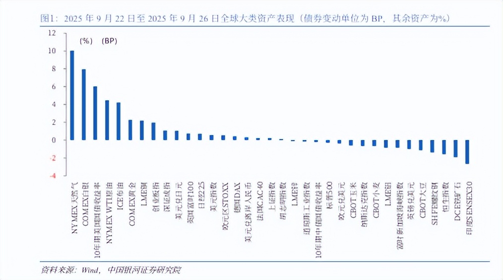 本周全球市场呈现避险资产与美元齐涨,风险资产分化的格局。本周黄金延续上周涨势,市场继续消化美联储降息影响。尽管如此,美国强劲的经济数据一定程度压制了黄金价格。本周原油的地缘风险溢价显著抬升。乌克兰对俄罗斯能源基础设施的持续袭击,已迫使俄罗斯削减燃料出口。美债在美联储降息后意外上行,主要受"预期兑现"交易、期限溢价扩大和强劲经济数据驱动。国内债市受股债跷跷板效应的影响,A股市场情绪强劲,分流债市资金。外汇市场上,美元走强,非美货币承压,美元指上行,英镑、欧元下跌,美元兑日元升破关键点位。全球股市分化,亚太偏弱,欧股(德/法股指上涨)相对稳健,美股纳、标普回调。亚太市场中,恒生、印度SENSE大跌,A股小幅收涨。