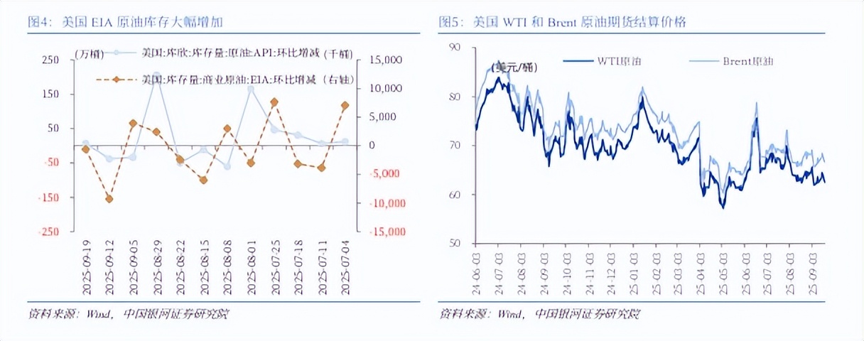 本周原油价格整体震荡上行,但涨幅受制于宏观压力。9月26日WTI原油和Brent原油收盘于65.72 美元/桶和70.13美元/桶,本周涨幅分别为4.85%和5.17%。从供应端来看,本周原油的地缘风险溢价显著抬升。乌克兰对俄罗斯能源基础设施的持续袭击,已迫使俄罗斯削减燃料出口。此举直接收紧全球成品油市场,并引发市场对原油供应稳定性的担忧。美国持续施压各国减少进口俄罗斯原油,进一步限制了俄罗斯原油的流通渠道。地缘冲突与制裁政策叠加,显著推高了原油的风险溢价。从需求端来看,强韧基本面提供支撑,近期强于预期的美国经济数据(如GDP、就业数据)缓解了市场对经济衰退的担忧,强化了原油需求前景的乐观预期。