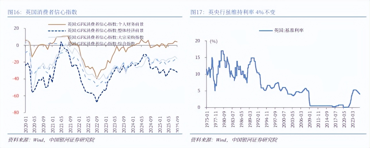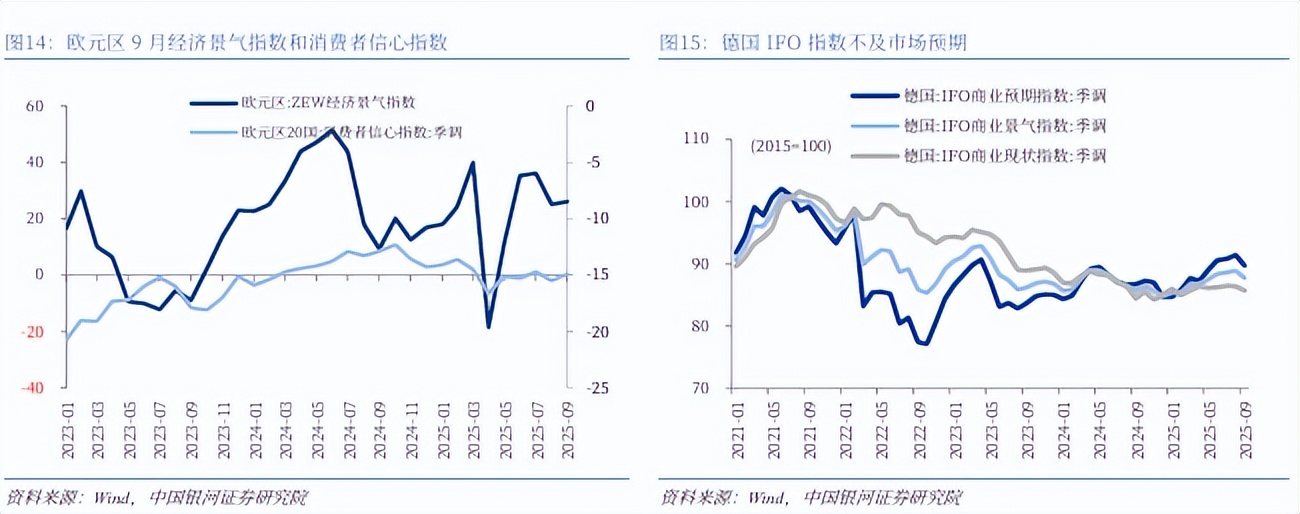 本周欧元兑美元汇率在强劲的美国经济数据和政策不确定性主导下,整体呈现震荡偏弱的格局。美国经济数据强,美元走强。欧美经济数据差异扩大。2025年9月欧洲ZEW经济景气指数和欧元区20国消费者信心指数分别为26.1(前值为25.1)、-14.9%(前值为-15.5%)。德国9月IFO商业预期指数、景气指数、商业现状指数89.70、87.7、85.7,低于市场预期,前值分别为91.4、88.9、86.4。