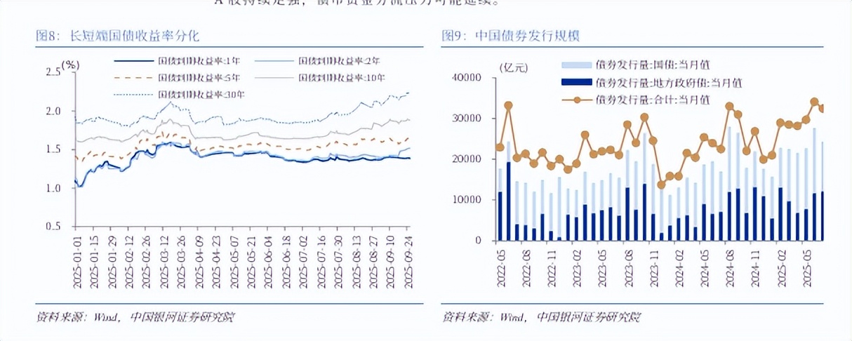 中长期来看,债券市场将受多重因素博弈影响,整体可能呈现 “上行有阻力,下行有动力” 的格局。从利多因素来看,当前经济数据普遍继续放缓,房地产领域尚未出现企稳拐点。若四季度GDP数据延续弱势,债市避险属性将强化。央行强调“以我为主”的支持性立场,且美联储降息(9月已落地)缓解外部约束,未来可能进一步降准或降息。从利空因素来看,若四季度“十五五”规划或稳增长政策超预期发力(如财政加码),可能推升通胀预期,引发债市调整。随着A股持续走强,债市资金分流压力可能延续。