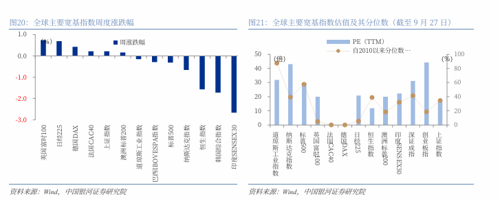 2025年9月22日至9月26日,股市表现与经济数据的相关性在减弱。欧美市场分化,英国、德国、法国股票市场上涨,美国股票市场下跌。强劲的美国经济数据强化了“利率维持高位”的预期,直接打压以成长股为主的美股。而欧洲股市(如英国富时100)则因权重股(能源、旅游)上涨以及对特朗普关税政策相对免疫而走强。亚太市场内部分化,日、澳,韩、印、港股跌。日本股市受国内刺激政策预期和日元贬值利好出口企业支撑。而韩国、印度和港股则更易受全球流动性(美债收益率上行)和特定风险(如印度面临外资流出)的冲击。在全球市场波动中,A股展现出韧性。全周科技股一度强势领涨,但周五因节前避险和外部利空大幅回调,最终周线小幅收红,呈现出明显的结构性特征和政策驱动色彩。
