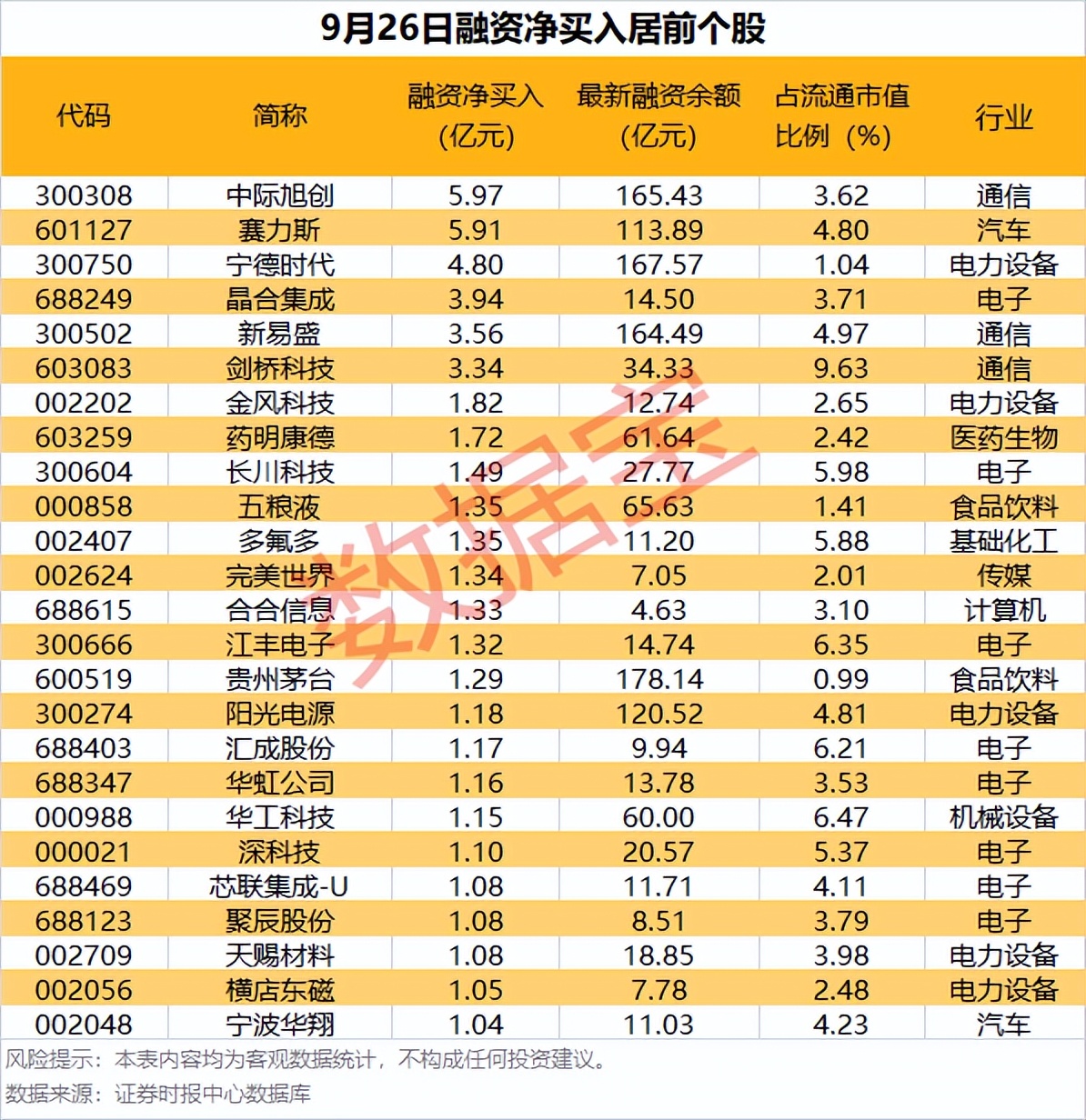 具体到个股,9月26日获融资净买入千万元以上的有373只,其中25只融资净买入均超亿元。中际旭创融资净买入额居首,当日净买入5.97亿元,其次是赛力斯、宁德时代,融资净买入金额分别为5.91亿元、4.80亿元,融资净买入金额居前的还有晶合集成、新易盛、剑桥科技等。