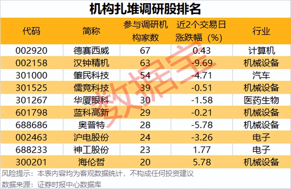 近两个交易日(9月25日至9月26日)共有76家公司公告机构调研记录。其中,10家公司获不低于20家机构扎堆调研,德赛西威、汉钟精机、肇民科技均有超50家机构调研。