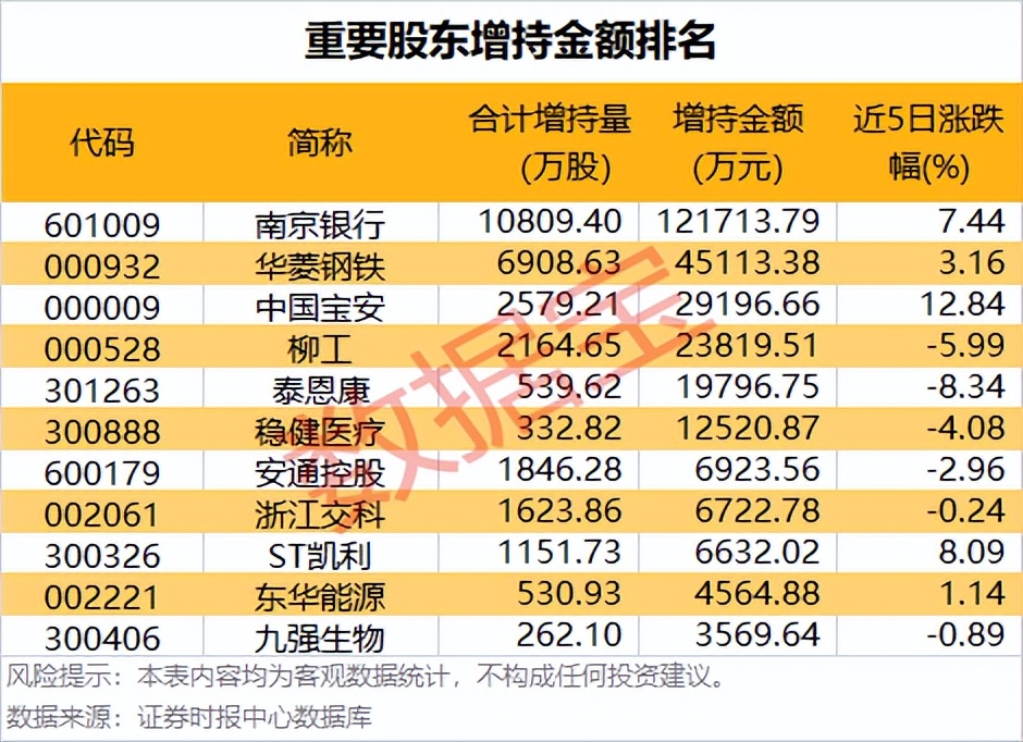 从增持金额来看,近5日增持金额在亿元以上的有6家,增持金额最多的是南京银行,其间累计增持1.08亿股,增持金额合计12.17亿元;其次是华菱钢铁,增持量为6908.63万股,增持金额4.51亿元;中国宝安近5日获股东增持2.92亿元,增持金额位居第三。