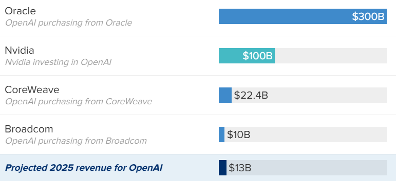 9 月末,Nvidia 宣布向 OpenAI 注资 1000 亿美元的消息,让纳斯达克与标普 500 指数创下历史峰值。这距离 OpenAI 与 Oracle 达成 3000 亿美元的 "星际之门"(Stargate)合作协议仅过去两个月,而在此之前,CoreWeave 刚刚将其 AI 基础设施供应额度从 119 亿美元翻倍至 224 亿美元。在这场算力军备竞赛中,OpenAI 的交易清单正以百亿级单位快速拉长。